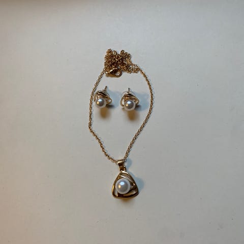Et vakkert og elegant sett med perler og skinnende sølv. Settet inkluderer håndlaget ring, øredobber og et kjede. Smykkene er stemplet med 925 S og trolig syntetiske perler. Ble kjøpt for flere tusen kr.