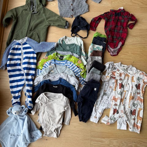 Klespakke fra røyk og dyrefritt hjem med klær i god stand selges. Uten hull og flekker (med forbehold om at jeg kan ha oversett noe). Ser to når jeg pakker sammen. Se bilder. Klærne er str 62. En bukse er ny med lappen på. Blanding av Newbie, HM etc, men ett par plagg fra GAP, Levis.