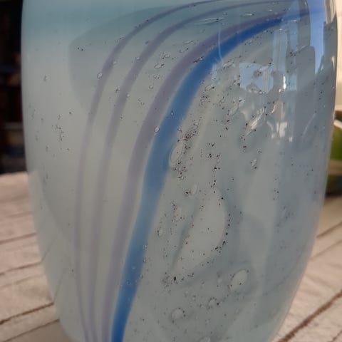 Stor vase i kunstglass, modell Contrast, designet av Anna Ehrner for Kosta Boda på 1980 tallet. Vasen er i meget kraftig og tungt blankt glass med håndmalte hvite virvler og smale glasstråder i blått og sort som kontrast. Det skaper et ekspessivt og kunstnerisk uttrykk som kjennetegner Ehrners arbeider.
