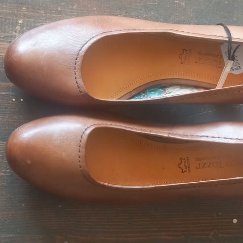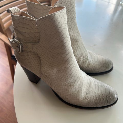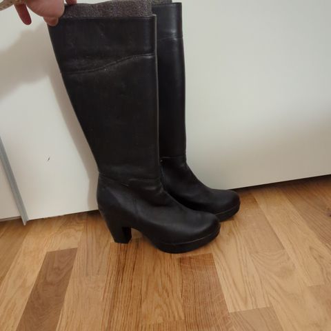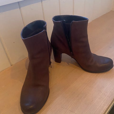 Lekre skoletter i skin. Fra Clarks. Str 41. Øvre delen med borrelås for bedre passform. 7,5 cm god og stødig hel. Ekstra riller under for demping. Stilige sko som passer like fint til bukse som skjørt. Kun prøvd på inne, så lagt til side og glemt. ( skadet kne og kan ikke gå på høye heler lenger)