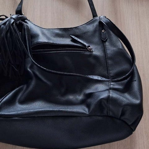 Veske, ikke skinn. Str. 34x23. Lite brukt, som ny. Sort med metall lenke.