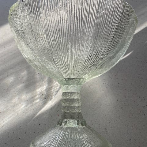 Flott stettefat i pressglass.Polsk Zabkowice Vintage. Dia på fat oppe 30cm, dia på fot 13cm,høyde 18cm. I meget bra stand.