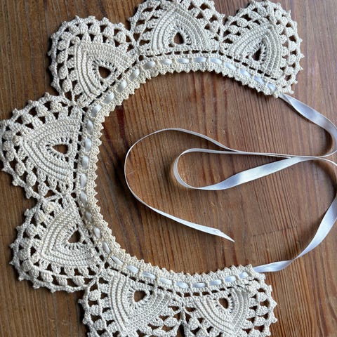 Heklet blondekant på 4 cm bred. ca 3,40 meter lang. Det var meningen å sy den på en kappe. Men det har ikkje blitt.