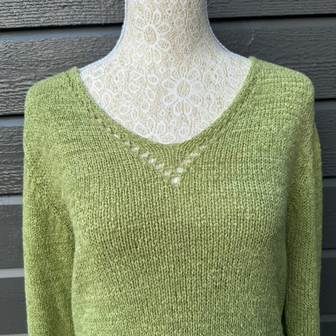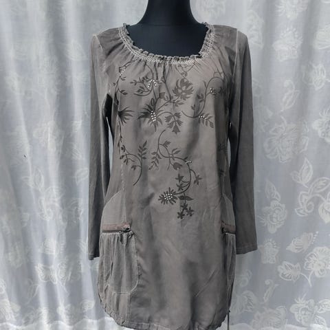 «Andrea» detaljrik genser i sort og hvitt fra Pm (Personlig mote). Svart blondekant midt foran og ned langs ermene. Ulikt stoff foran og bak og nederst på ermene. Str. M, 38/40 og romslig. Pent brukt.