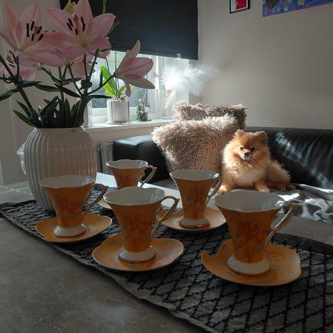Blad gull i kanter, så kan ikke vaskes i maskin. Usikker hvilken karat gull det er.