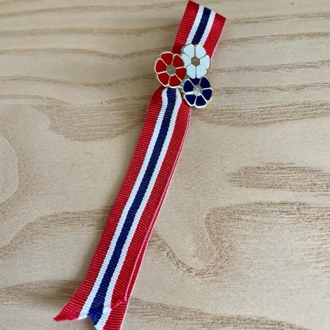 17. mai sløyfe, som egentlig er en hårsløyfe, men vi har brukt den som 17. mai sløyfe til baby gutt / småbarn gutt til dress eller finskjorte. Setter klipsen inn i skjortekragen. Klipsen har et antiglibelegg som gjør at den sitter på plass.
