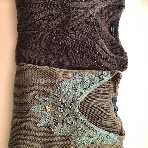 Selger 7 pent brukte sommergensere i str M. Se under hvert bilde hva slags materiale det er i de. Alle selges til kr 30,- pr stk. Kan sendes men da kommer frakt i tillegg.
