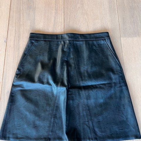 Sort semsket skinnskjørt i nesten A - fasong fra AneMone. Str 42. Livvidde 92 cm. 53 cm lengde.