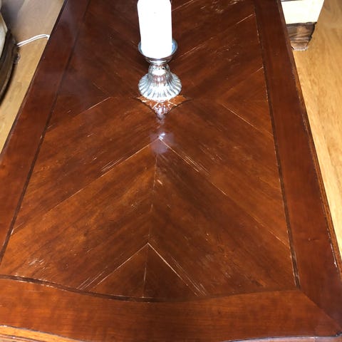 Mexicansk stil. 4 skuffer i salongbordet. En kantlist delvis løs siden 2008, kan limes/plugges