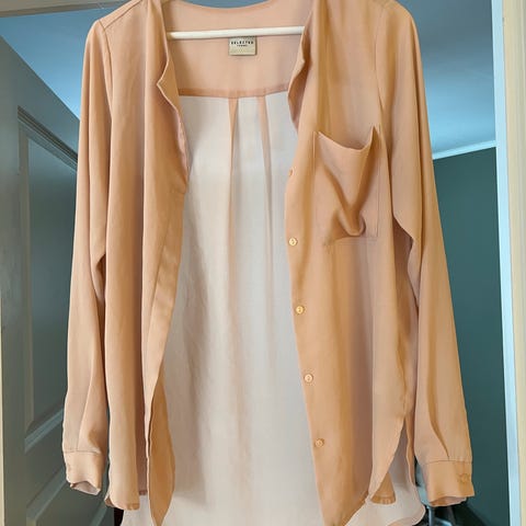 Nydelig ferskenrosa dobbel chiffonbluse med vakker blondefelt på ryggen
