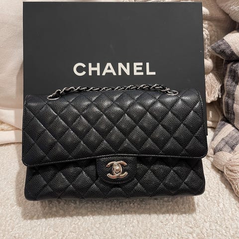 Elegant veske fra Chanel i modellen: GST, grand shopping tote. Denne modellen er ikke lengre i produksjon. Dette er en unik mulighet for alle chanel elskere. Skinnet er i caviar og det er meget slitesterkt. Fargen er svart og hardwaret er sølvfarget.