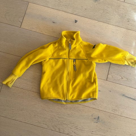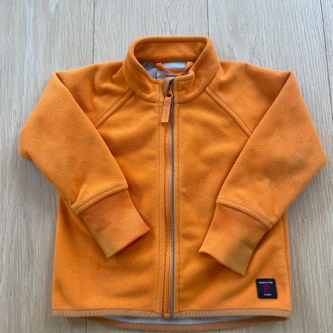 Vindfleece fra PoP i frisk oransje farge. Den er godt brukt, men har mye bruk igjen. Str. 74, men noe romslig i str.
