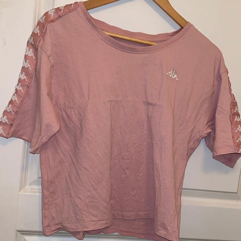 Lilla, kort, croppet, oldschool, sweatshirt tee, t-skjorte med hvite kanter og gulgrønn kontraststriper. Knyting i hem. Rund hals og korte ermer. 90% bomull, 10% elastan.