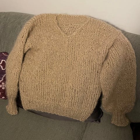Genseren er strikket i 2 tråder Bella fra Permin: 75 % kid mohair, 20 % ull og 5% polyamid. Den er benyttet som utstillingsmodell i en garnbutikk og er profesjonelt strikket.