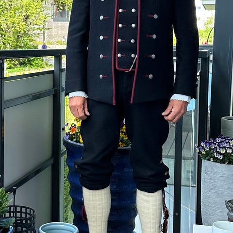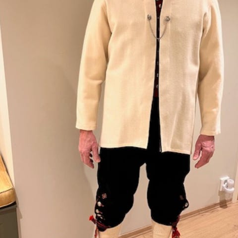 Jakke («flasketrøye») til Fanabunad. Meget pent håndarbeid. Brukt kun 2 anledninger. Selges fordi den ikke passer lenger. Størrelse ca XL (skulderbredde 55cm, ermelengde utv. mål 63cm, lengde 83cm fra overkant krage. Kontakt Turid 92897183