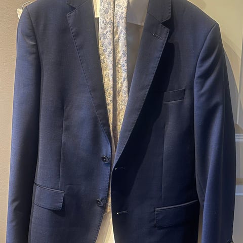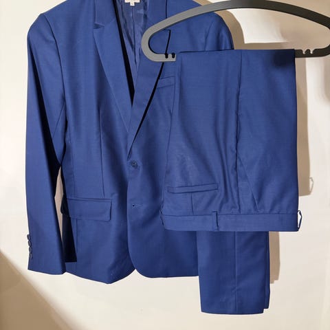 Flott dress i struktur vevd blå tweedaktig stoff fra H&M. Jakken er i størrelse 170 og den matchende bukse er i størrelse 164. Jeg har også en hvit skjorte i størrelse 164. Alt er strøken.