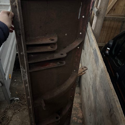 Sjølve bladet er ca 240cm. Festa nede er frå ca 75cm - 100cm. Høgda frå nedre til øvre feste er ca 60cm. Frå festa framme til festa til hjula er det ca 120cm.