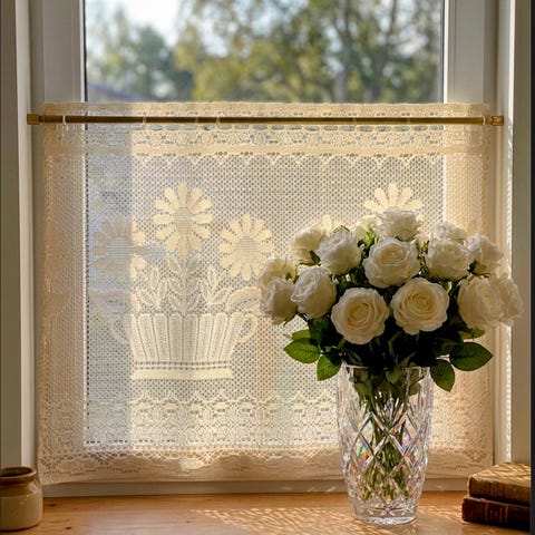 Lys beige, håndheklede gardiner evt. 2 duker. 1,45 ×0,64 m.