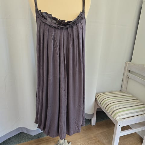 Søt kjole i glanset stoff fra Cream i størrelse 38-fargen er brunlig med litt lillaskjær. Strikk under brystet og i ryggen-målt under brystet er den 72-92 cm. Regulerbare skulderstropper-lengde er 94-104 cm (målt fra ryggen er den 75/79 cm-lengst foran). Laget av 100% viskose.