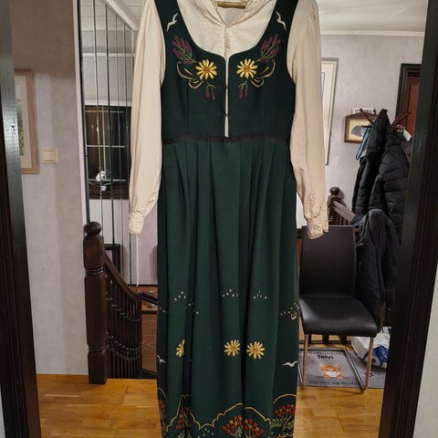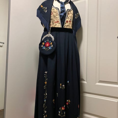 Selger en voksen bunad passer S - M og barnebunad passer 5 - 12 år.