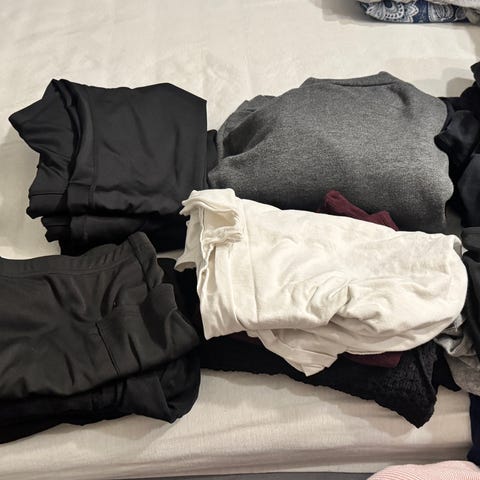 Pakke med gravid/mammaklær str. +/- XL. Noe ubrukt og det andre er pent brukt. Inneholder 5 bukser, 1 kjole, 3 sykkelshorts, 7 topper/singletter..