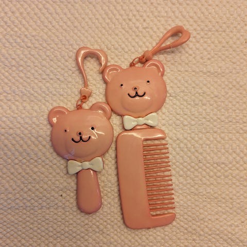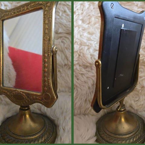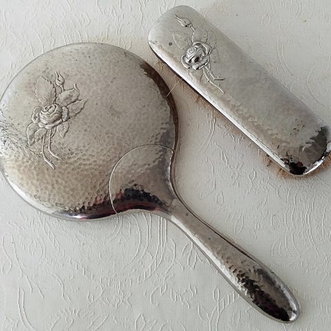 Bokstav eller monogram på både børsten og speilet, men ser ikke helt hva som står.