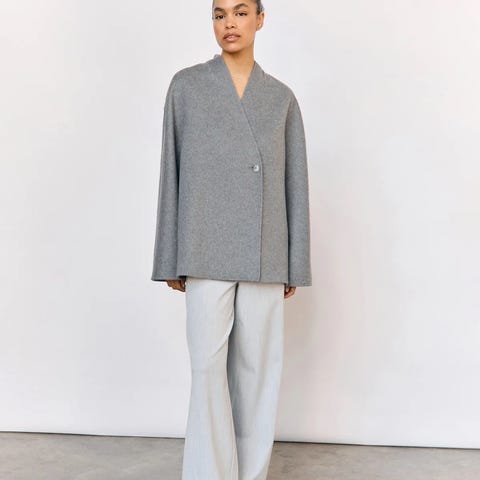 Trendy omslagsjakke i tynn ullkvalitet med knyting i livet og v-hals. Materialer: 50 % Ull, 45 % Polyester, 5 % Andre fibre.
