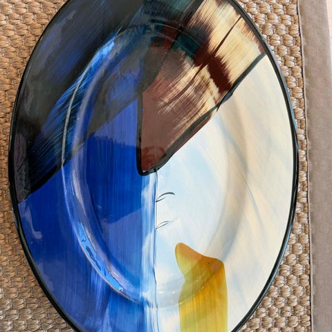 Flott stort glassfat fra Magnor Glassverk i hvitt og turkis. Nydelig og sommerlig!