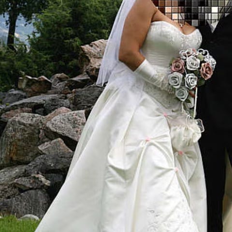 Brudekjole til salgs. Brukt en gang. Vasket på renseri og oppbevares i stoffpose. Justerbart liv med snøring i ryggen med silkebånd,. Størrelsen kan dermed justeres i forhold til livvidde. Blonder og små krystaller dekorerer øverste del av kjolen. Skjørtet ligger i mange folder som gir en vakker effekt når man går.