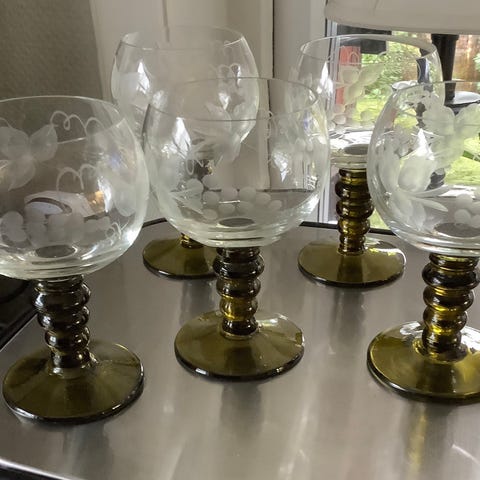 4 nydelig hetvins glass i serien Røyne. Dekor drueklase og greiner. H: 9cm, Ø: 6cm. Selges samlet.
