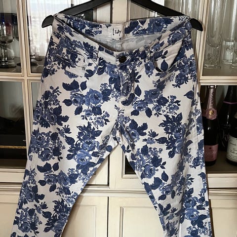 Mørk blå, str 36. God stretch, ingen anmerkning. 50% viscose, 47% bomull, 3% elastane. Vaskes på 30 grader