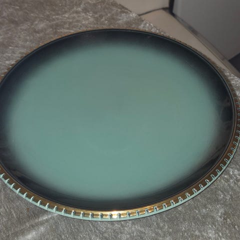Pent fat med gullkant fra Stavangerflint selges for 150 kr. Fatet er 33,5 cm i diameter