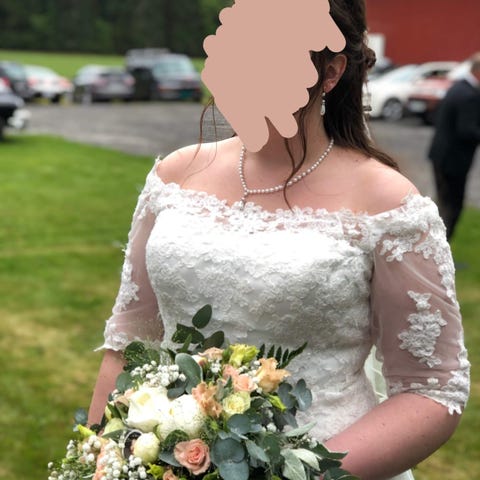 Selger min flotte brudekjole. Brukt en gang i April 2022. Str 40 vil jeg si den er og kan lett syes inn igjen om tilpassing ønskes. Beltet er sydd på og kan lett tas av. Kjolen er veldig flatterende og stødig i stoffet. Jeg er 163 cm høy og jeg brukte 8cm hæler. Kjolen er ferdig renset og klar til bruk. Kom gjerne hit for å prøve den om du vil. Selger også et cape som jeg brukte på bryllupsdagen til kjolen for 800kr.