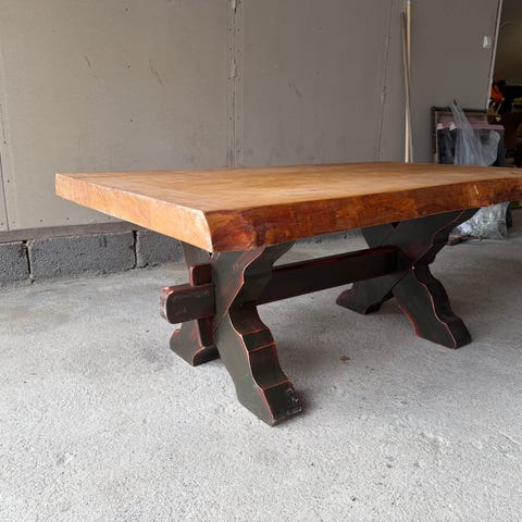 Bord i countrystil,helt nytt fra snekkerverkstedet.Bordet er limt med treplugger,som gjør det ekstra solid.Bordet er slipt ned etter et strøk med lakkbeis i svart eik.Det er satt på dekorspiker rundt hele bordplaten