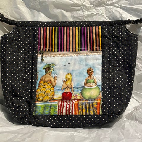Ny toalettmappe i lappeteknikk.Ytterstoff ,vatt og for.Mål:48/23 cm.Glidelås i topp.Kan vaskes.Har vipps.Porto tilkommer.