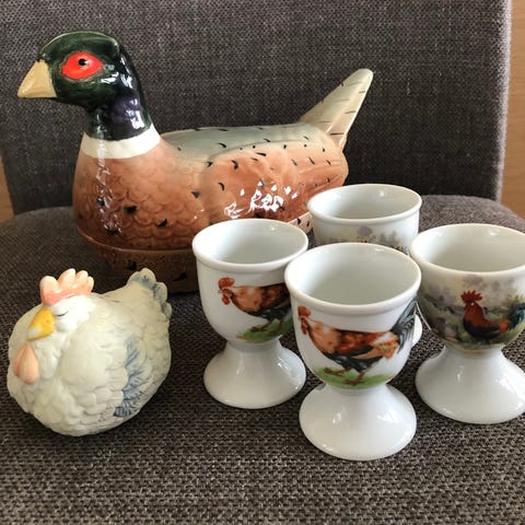 1.) Eggholder med plass til 6 egg og med total diameter ca 23cm og ca 11cm høy. Morsom sak i fin stand. Se bilder for flere detaljer.