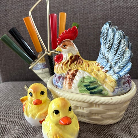 3.) Morsom hønefigur av nyere dato og i fin stand. Dekorativ som pynt til påske. Ca 17cm høy.