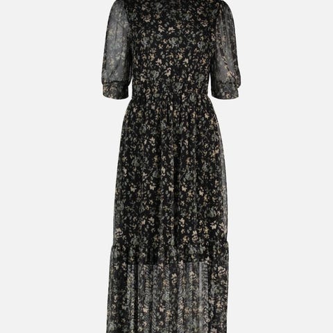 Selger en fantastisk vakker maxi-kjole i sort blonde med paljett- og broderidetaljer i rosa og gull. Kjolen har en elegant passform, korte ermer og flotte detaljer i ryggen.