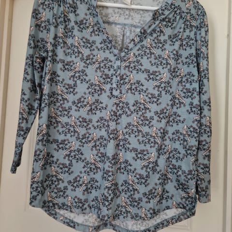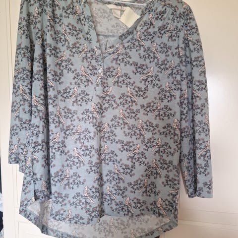 Hvit bluse med nydelige tegninger av fugler i duse farger. Str S, men passer vel så godt M, og trolig også L.