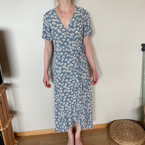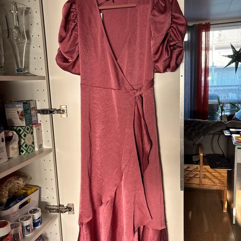 Fin omslagskjole fra John Zack i str. 38. Passer godt til bryllup og andre sommerfestligheter. Det er denne, bare i en rosafarge som ikke selges lenger: https://www.bubbleroom.no/p/john-zack/klaer/kjoler/short-sleeve-wrap-dress-sage-green