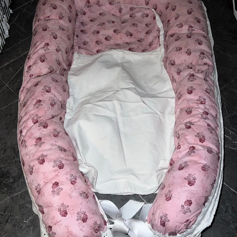 Hjemmelagd / sydd babynest med dus rosa innside og marineblå utside. Med tykk skummadrass inni.