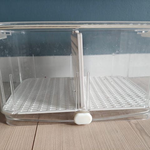 Fyll boksens to små dørslag med det du vil oppbevare. Overflødig væske renner av og innholdet holder seg ferskt lengre