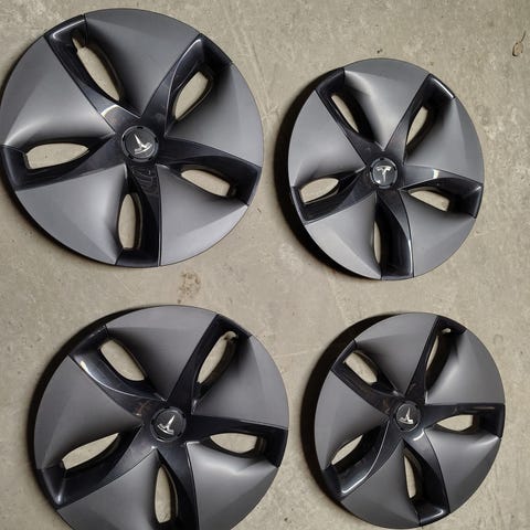 Tesla Model 3 hjulkapsler. De har kun vært på bilen da den ble kjøpt ny, ellers har de vært tatt av og ikke brukt. Må hentes, sender ikke.