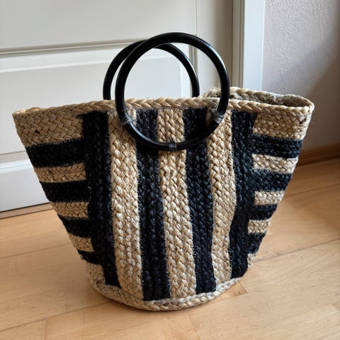 Selger en brukt Bag / strandbag fra Sunflair beachfashion. Veldig fin og praktisk strandveske til å ha med seg ved bassenget eller stranda. Rommer mye, samtidig som den ikke ser for voldsom ut. Har noen få bruksmerker, blant annet har det vært ett ett lite hull i nettingen, men er reparert. Synes minimalt. Den har to lommer i front, en med glidelås og en med borrelås. Den har to nettinglommer. Innvendig har den en lomme uten glidelås ( der du får plass til en mobiltelefon og en lomme med glidelås. Meget praktisk veske. Mål: ca 58 cm x 38 cm.