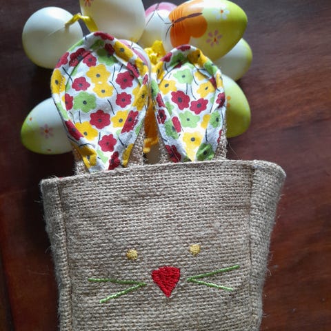 Liten påskeegg-kurv av stoff. Ca, 15cm høy. Gult stoff med hvite prikker på utsiden, og blått stoff innvending med høner og egg.