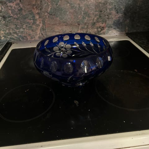 Krystall glasskrukke fra Bohemia, ingen bruksmerker. Høyde 19 cm