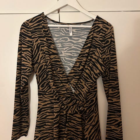 Selger pent brukt dyremønstret lett ermeløs bluse med lang bak fra Rut m.fl. for 50 kr.