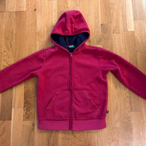 Pent brukt fleecejakke fra HM i str. 98/104. Blå jakke med rosa detaljer og hull til tommel.
