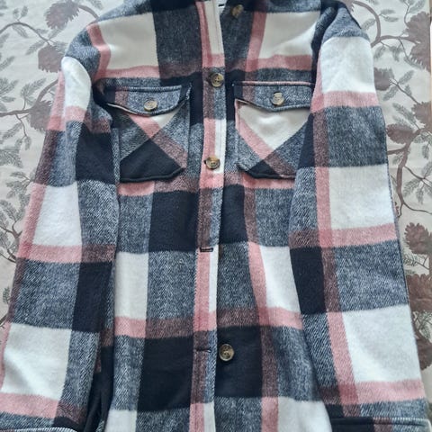 Selger denne pent brukte skjortejakken fra H&M. Materiale: 6 % ull, 15 % akryl, 3 % polyamid og 76 % polyester. Vaskes på 30 grader. Kun brukt noen få ganger. Bredde: 42 cm målt under ermene.