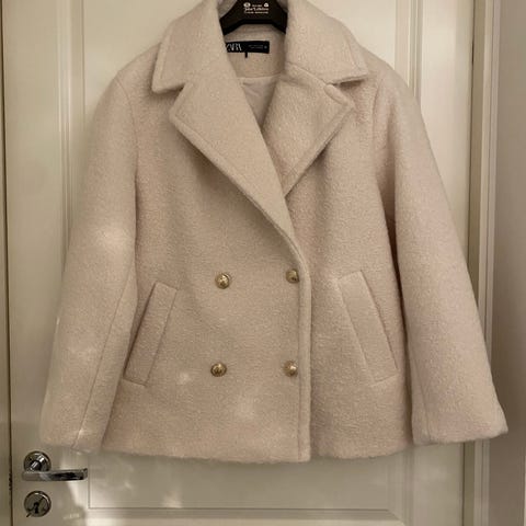 Annet yttertøy for kvinner i størrelse S, beige farge. Jakken har en lang modell med lommer foran og knappelukking. Materialet er mykt og teksturert, egnet for utendørs bruk.
